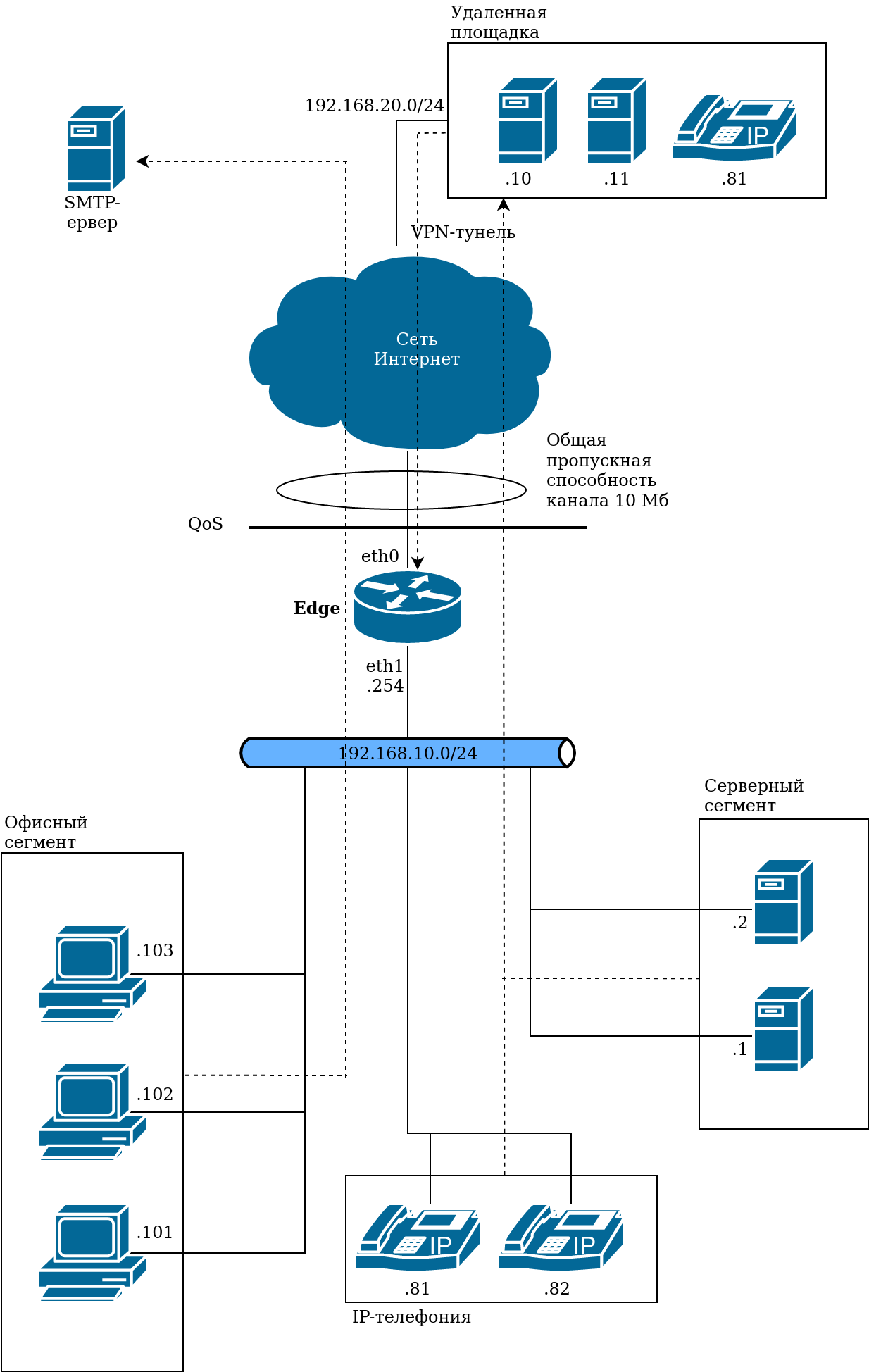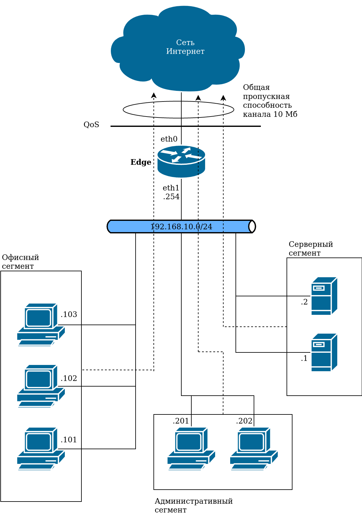 На рисунке показана простая сеть филиала с использованием QoS в Numa Edge (edge). В схеме представлен сегмент сети, у которого в качестве маршрутизатора установлен Edge. Ширина канала, предоставляемого провайдером, равна 10 Мб. Локальная сеть поделена на несколько сегментов: Серверный сегмент, Административный сегмент и Офисный сегмент.