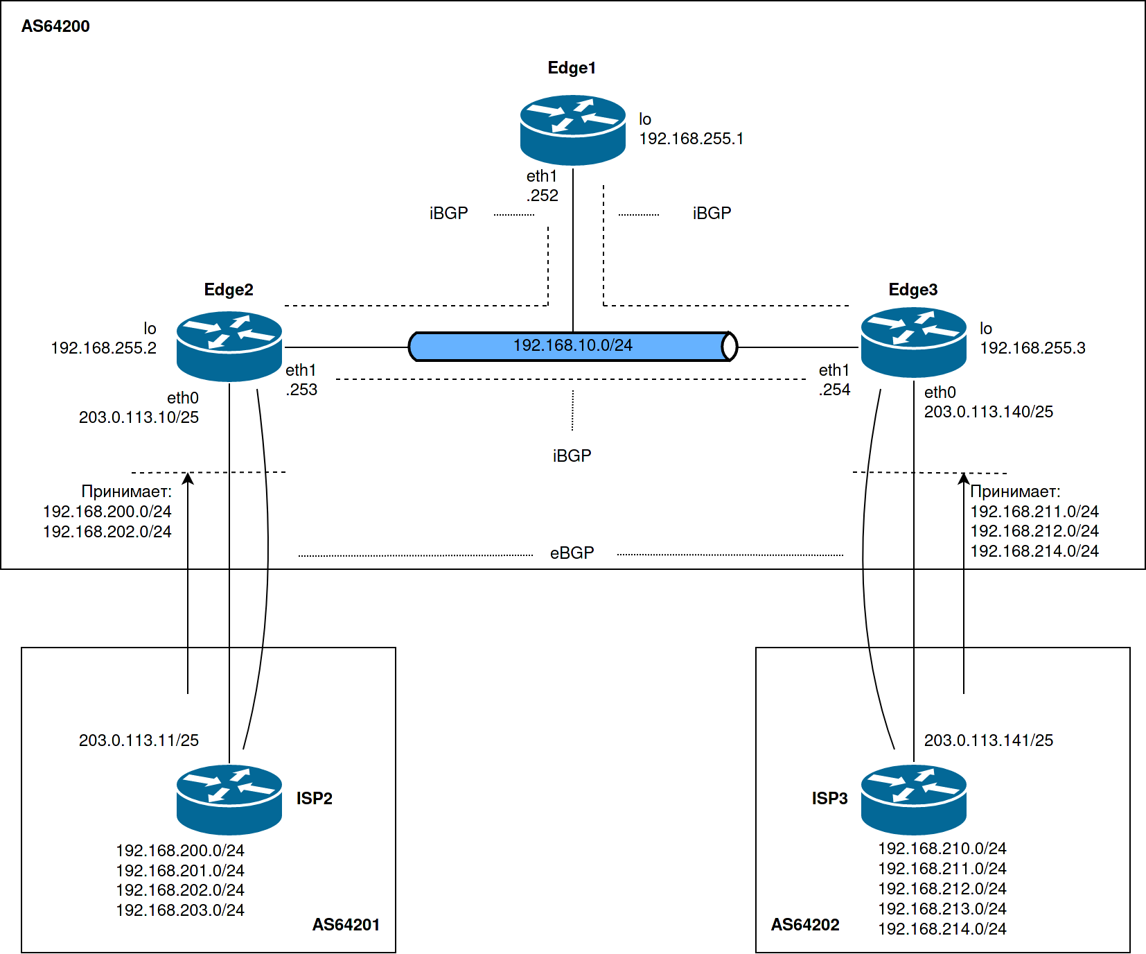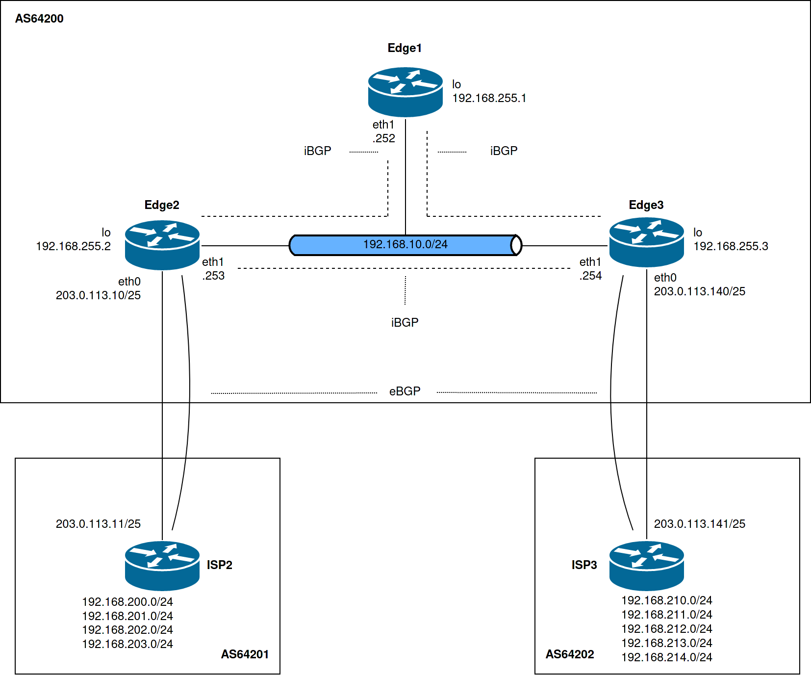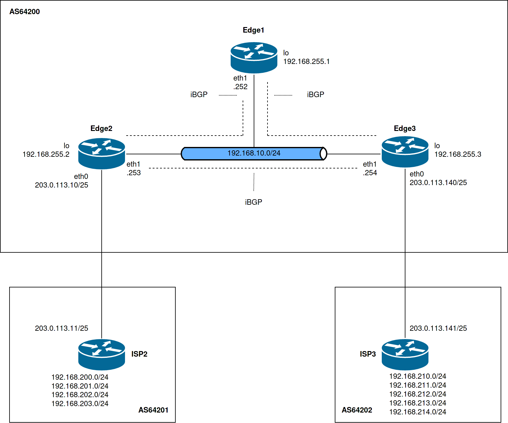 В данном примере рассматривается настройка iBGP на трех маршрутизаторах, обозначенных как Edge1, Edge2 и Edge3 на рисунке. Каждый маршрутизатор соединён посредством iBGP с каждым другим маршрутизатором (схема «каждый с каждым»).