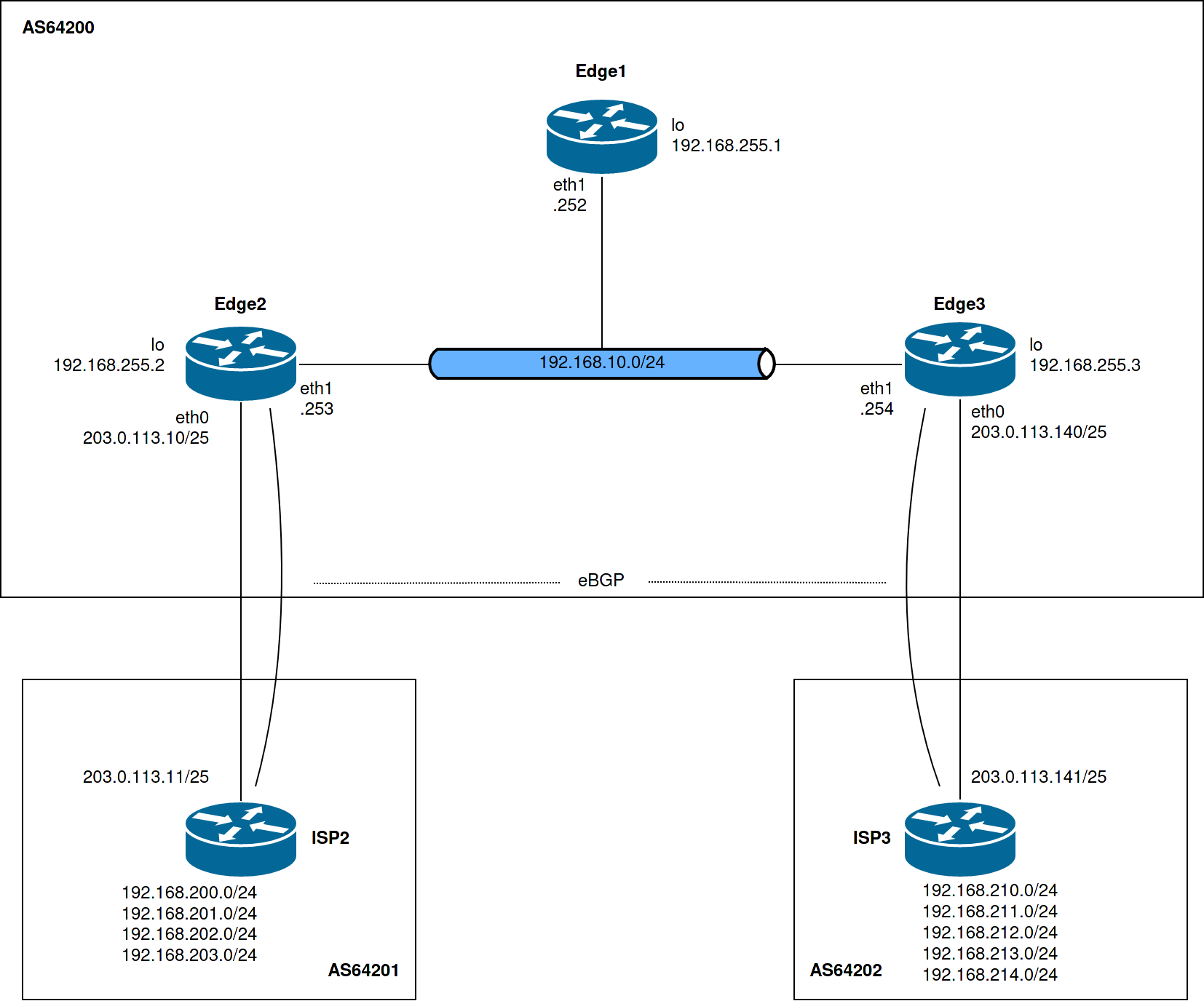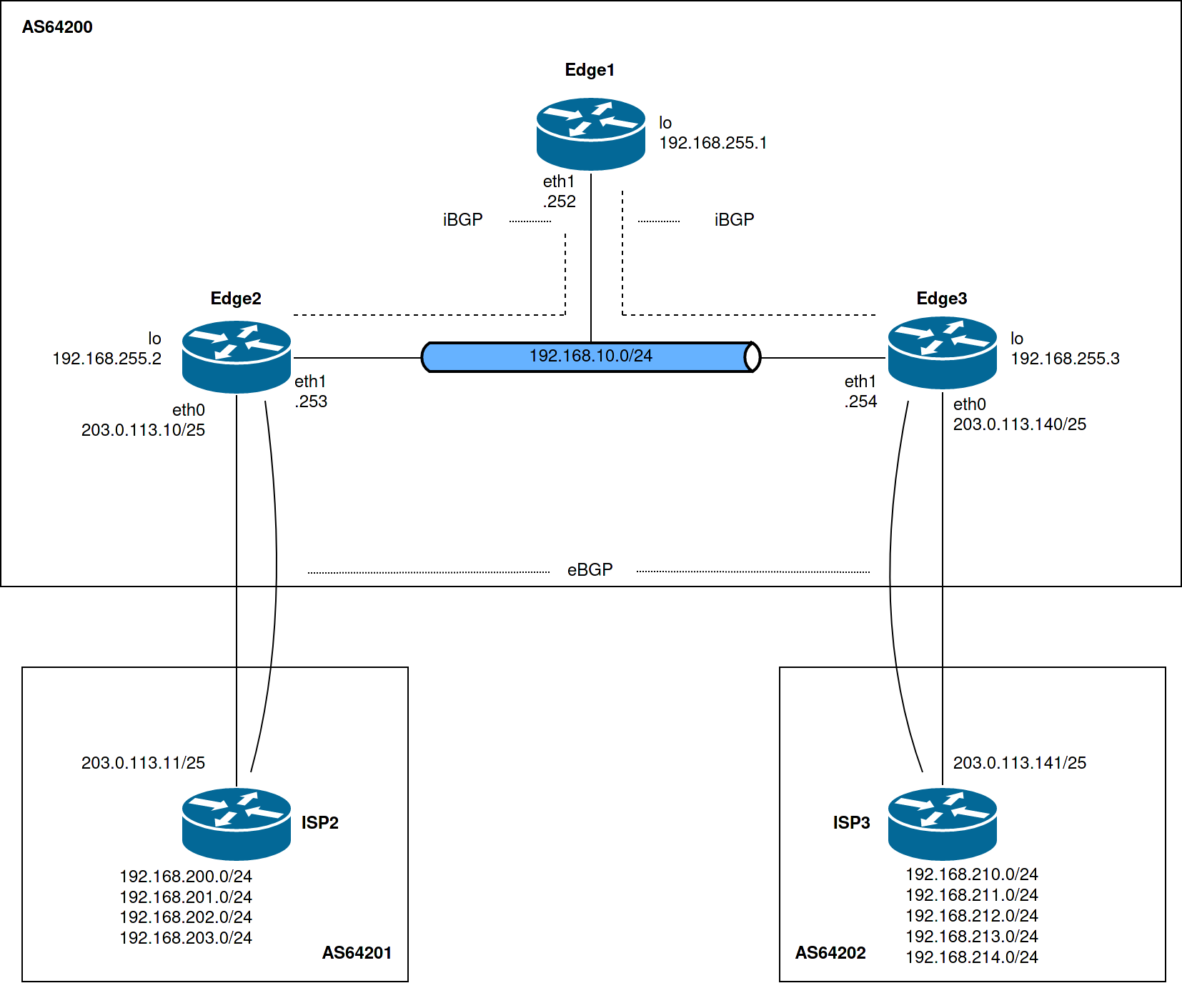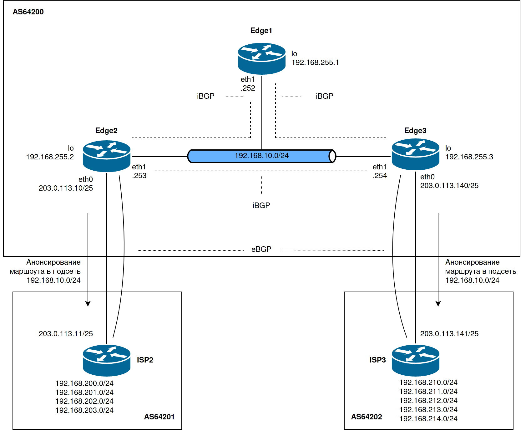 В данном примере рассматривается настройка iBGP на трех маршрутизаторах, обозначенных как Edge1, Edge2 и Edge3 на рисунке. Каждый маршрутизатор соединён посредством iBGP с каждым другим маршрутизатором (схема «каждый с каждым»).