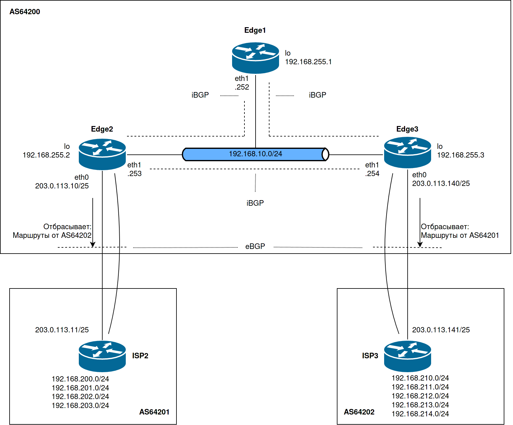 В примере описана настройка исходящих маршрутов таким образом, чтобы AC номер 64200 не предоставляла возможность транзита для АС номер 64201 и АС номер 64202. Таким образом, маршруты узлов eBGP, подключенных к маршрутизатору Edge2 (АС номер 64201), не должны пересылаться узлам eBGP (АС номер 604202), подключенным к маршрутизатору Edge3 и наоборот.