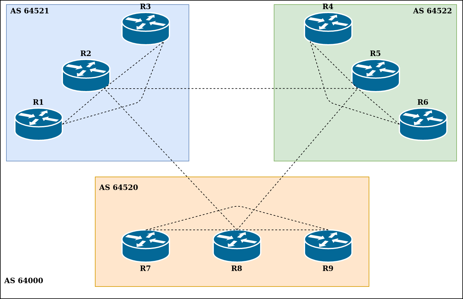 На рисунке показано разделение АС на три автоматизированные подсистемы, образующие конфедерацию. Внутри автоматизированной подсистемы узлы соединены по схеме «каждый с каждым», сами же подсистемы соединены посредством eBGP.