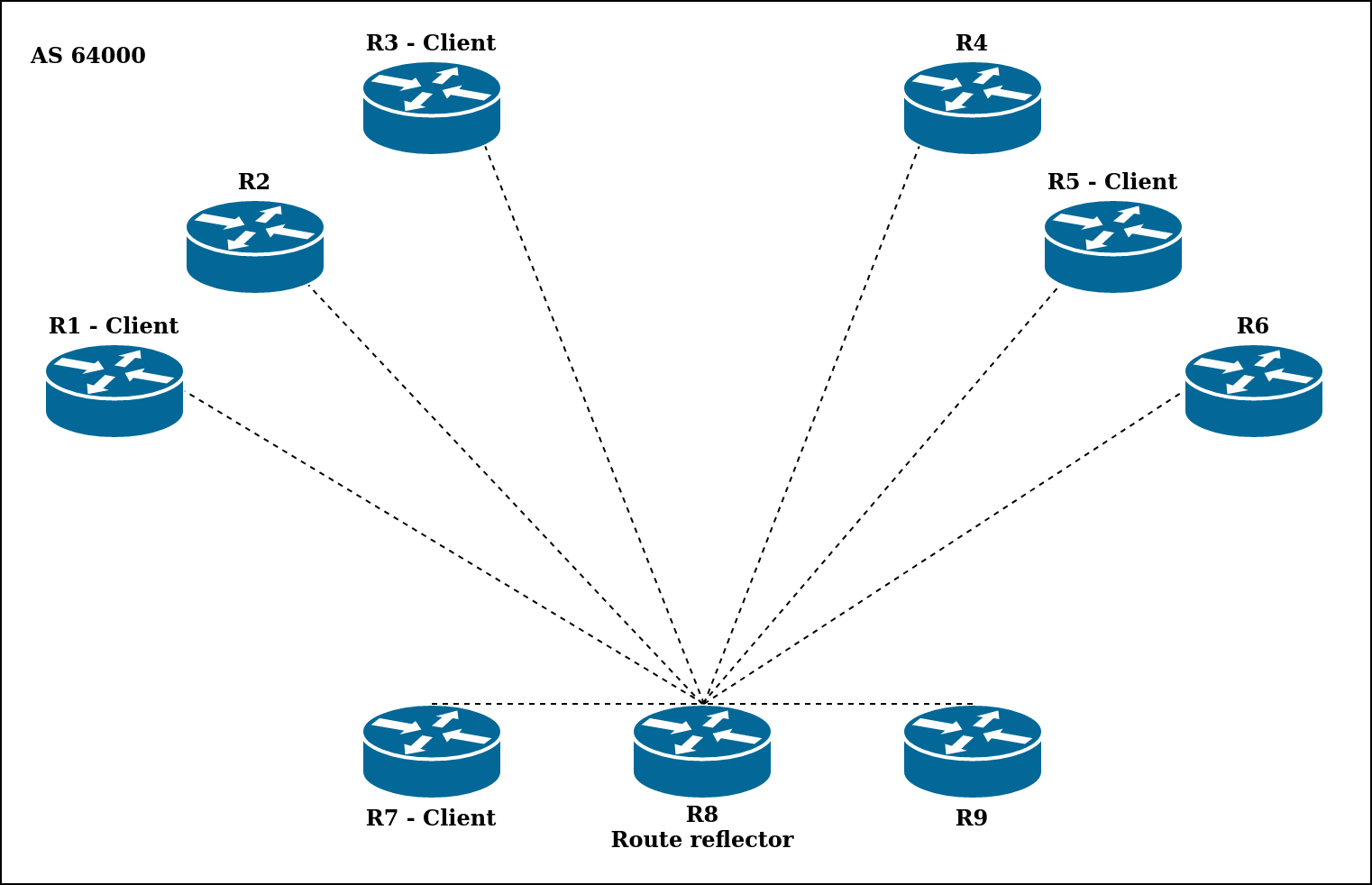 Внутри кластера, каждый клиент должен соединяться посредством iBGP с одним или несколькими отражателями маршрутов. При этом отсутствует необходимость наличия соединения между клиентами внутри кластера.