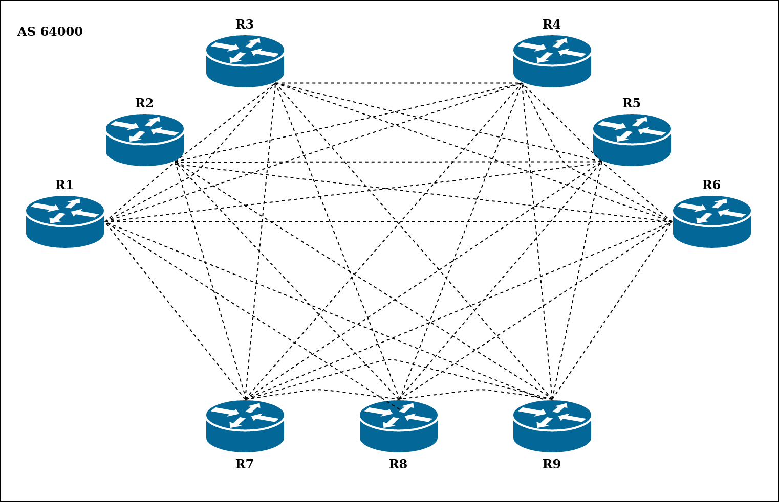 На рисунке показана АС, состоящая из девяти узлов iBGP, соединённых по схеме «каждый с каждым».