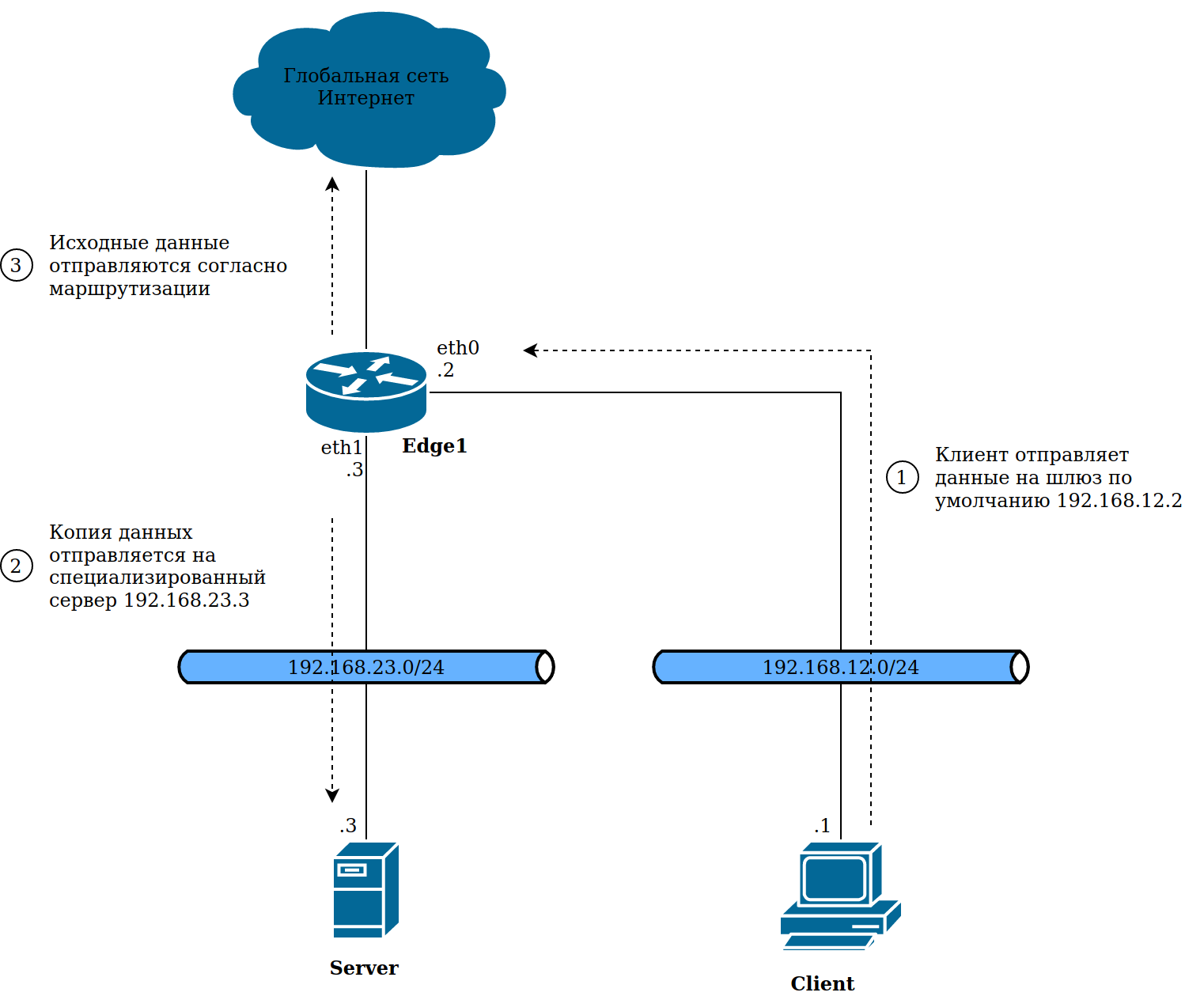 В данном разделе приведен пример настройки для политики клонирования трафика. Пример рассматривает настройку политики клонирования входящего на интерфейсе Ethernet eth0 по протоколу IPv4 на шлюз 192.168.23.3