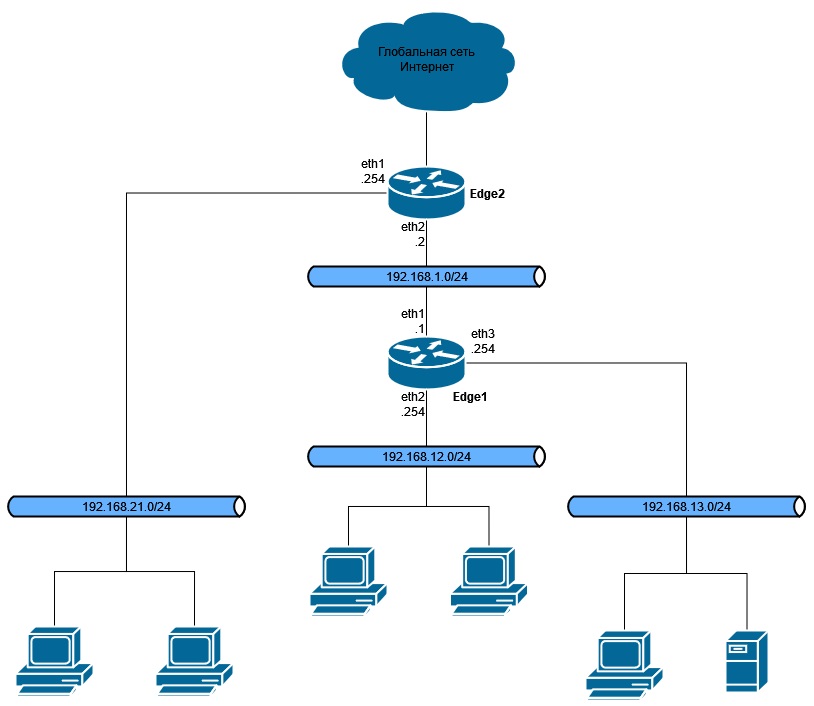 В примере ниже приведена настройка узла Edge1 в качестве агента ретрансляции DHCP.
