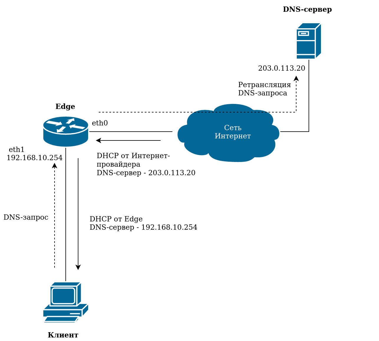 На рисунке ниже показана типичная схема применения ретрансляции DNS. На этой схеме: