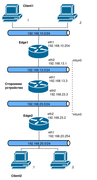 Клиенты client1 и client2 (это, например, обычные компьютеры под управлением любой ОС, поддерживающей многоадресные передачи) должны быть настроены в соответствии с топологией сети, представленной выше. Так, чтобы client1 видел client2, например: