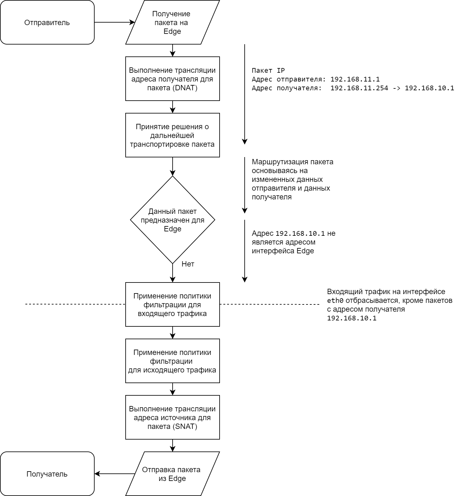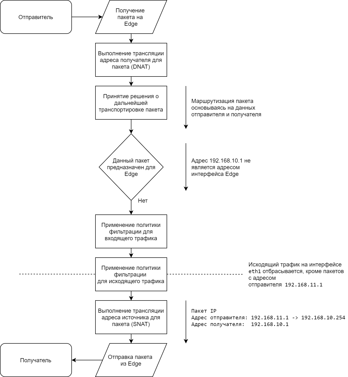 Следует заметить, что соответствие политикам межсетевого экранирования проверяется после DNAT и маршрутизации. В текущем варианте SNAT не выполняется.