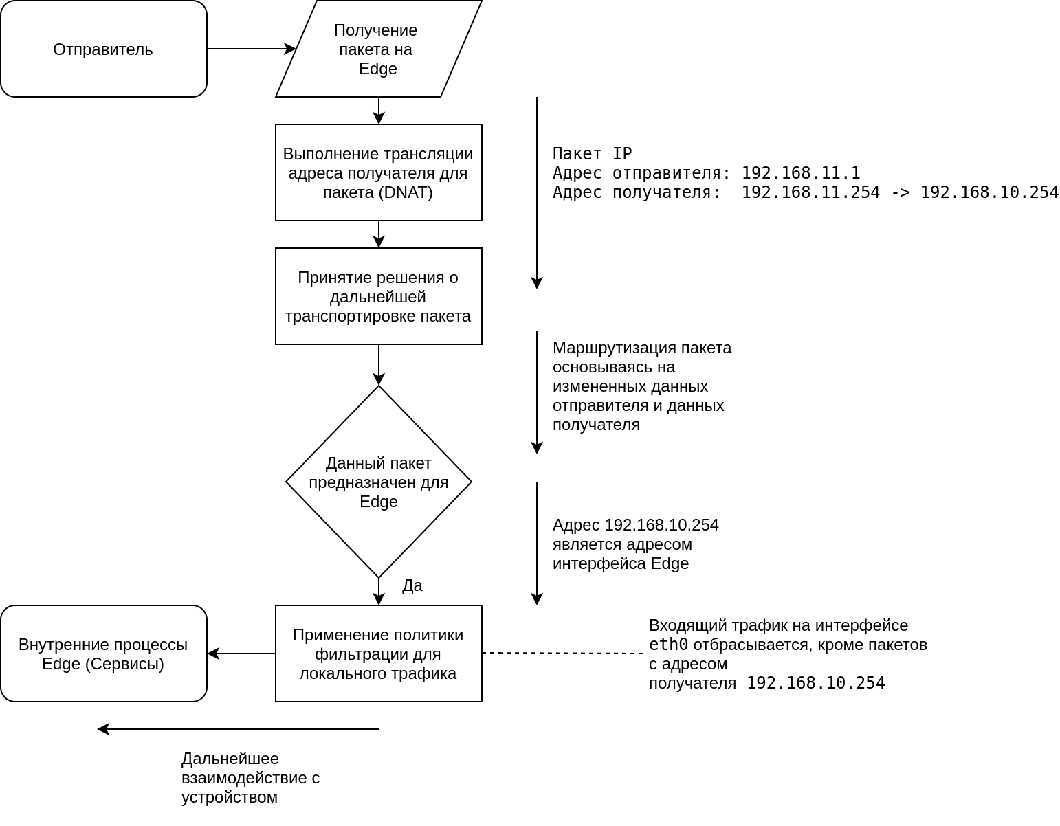 - Применение политики межсетевого экранирования FW-local к входящему трафику интерфейса eth0, предназначенному для Edge: