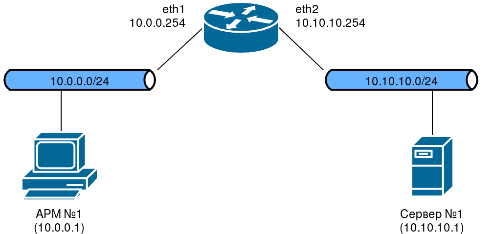 - Изделие Numa Edge, являющееся шлюзом по умолчанию для АРМ№1 и Сервер №1, с адресами 10.0.0.254/24 (порт eth1, подключен к АРМ №1) и 10.10.10.254/24 (порт eth2, подключен к Сервер №1).