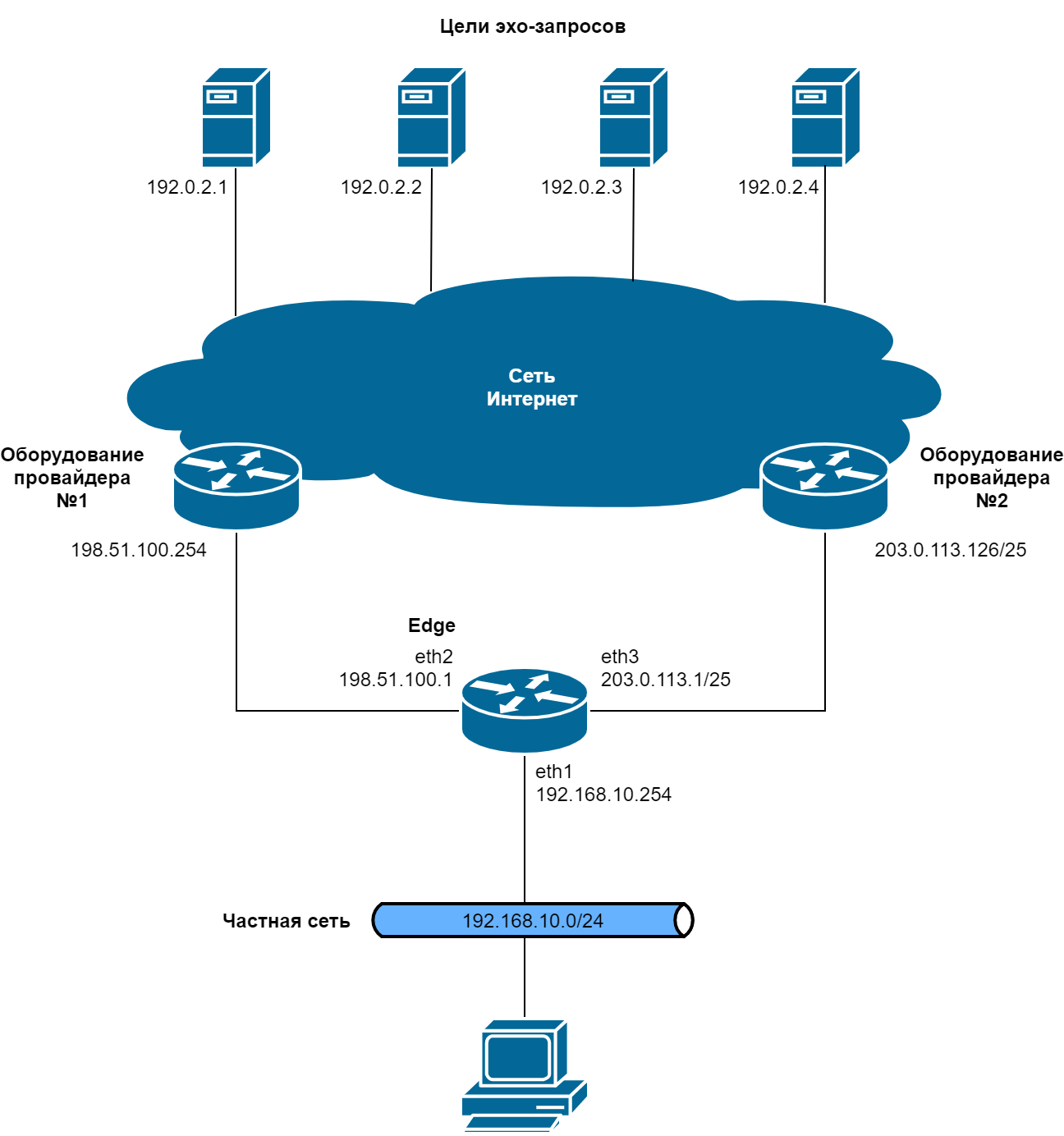 - Указание в качестве первой цели эхо-запроса ip-адреса 192.0.2.1 для Gateway_ISP1: