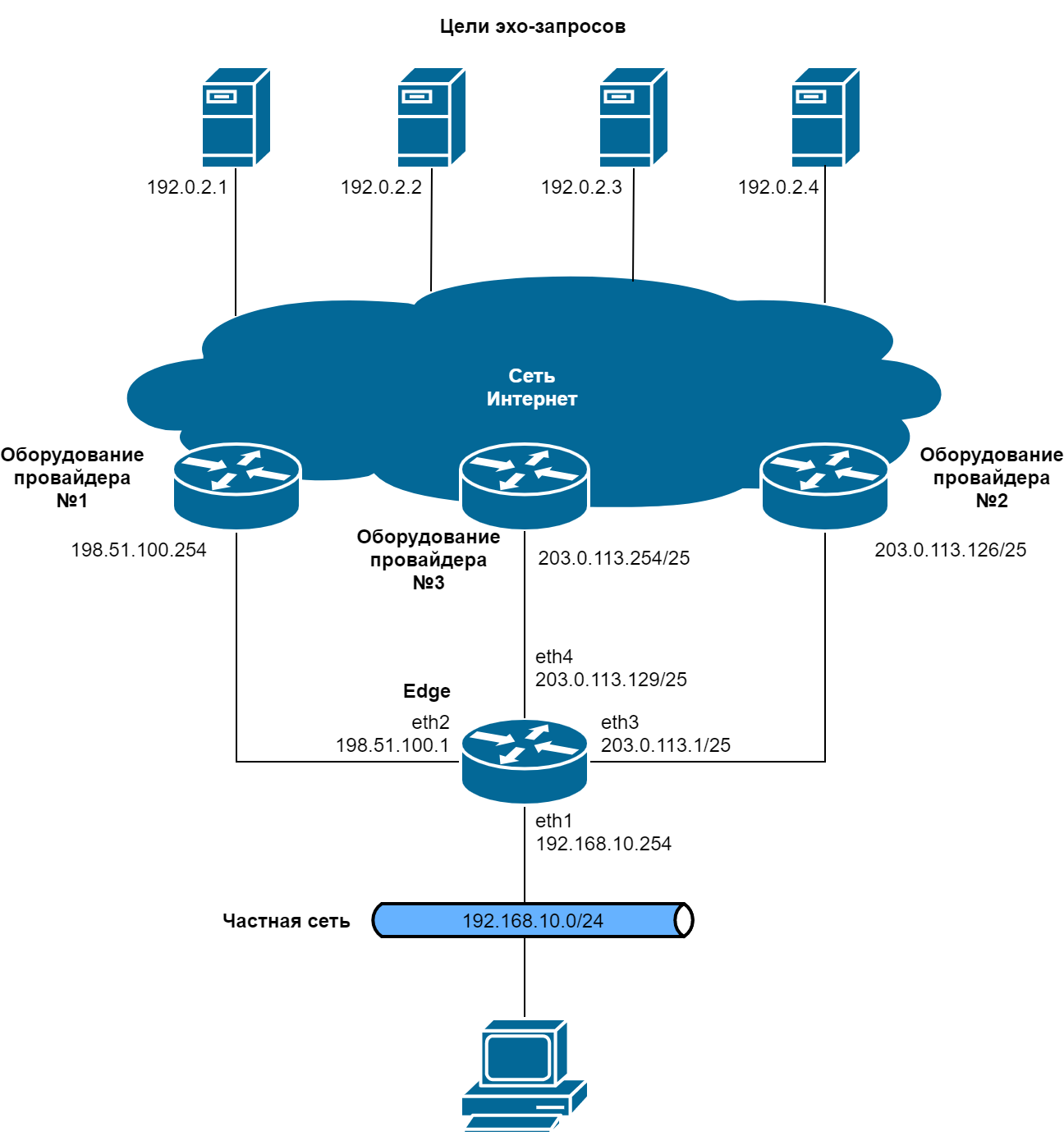 - Указание в качестве первой цели эхо-запроса ip-адреса 192.0.2.3 для Gateway_ISP2: