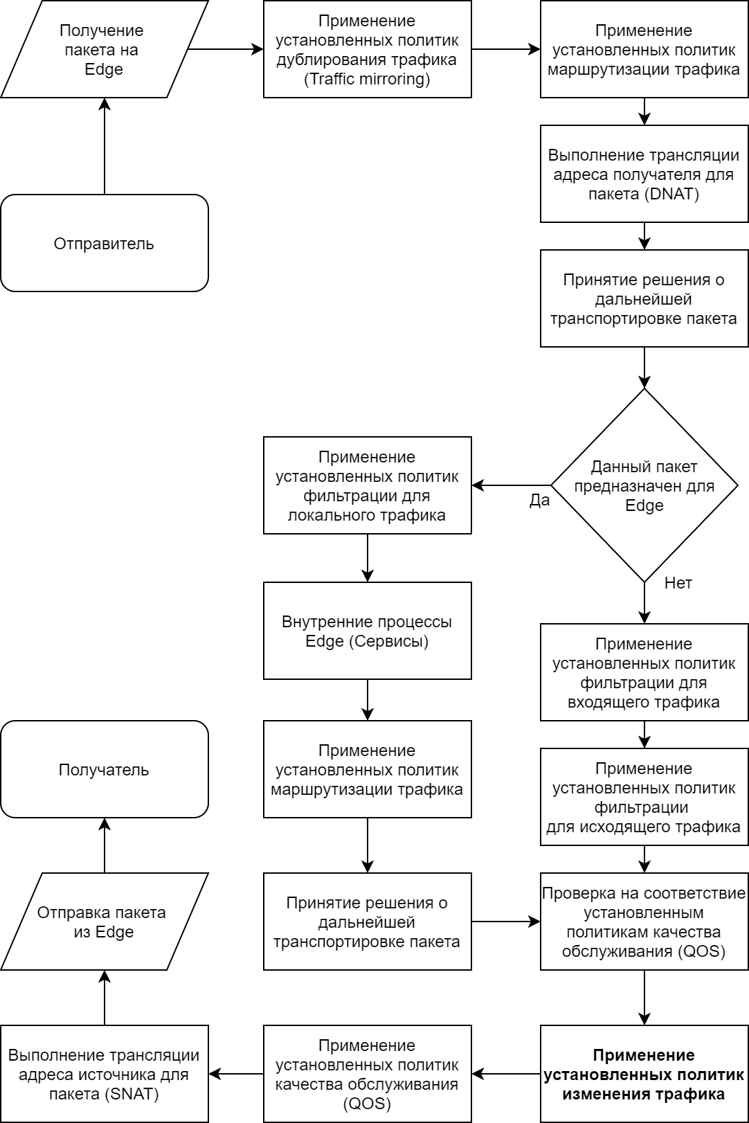Политики модификации трафика применяются последними перед отправкой данных: после маршрутизации, межсетевого экрана, применения фильтров QoS, но до непосредственной обработки QoS.