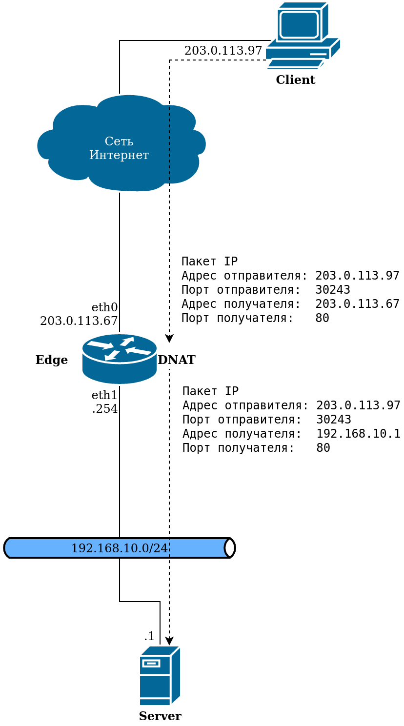 Например, преобразование сетевого адреса получателя может быть использовано в том случае, если в корпоративной сети есть веб-сервер, который принимает подключения от устройств внешней сети, но при этом не инициирует исходящих сеансов.