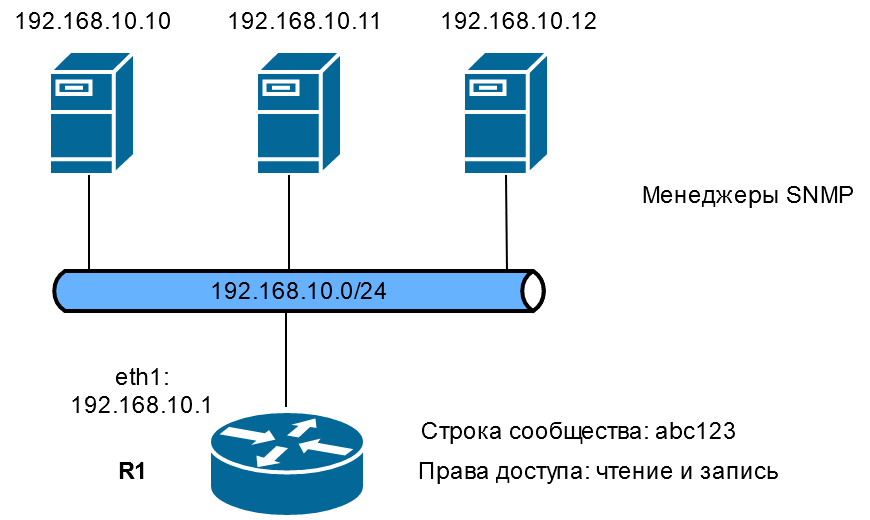 В примере ниже в качестве строки сообщества SNMP указывается abc123, а также определяются 3 клиента для данного сообщества: 192.168.10.10, 192.168.10.11 и 192.168.10.12. Для данного сообщества устанавливается доступ на чтение и на запись.