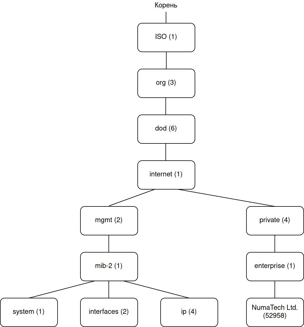 SNMP (Simple Network Management Protocol) — это протокол управления сетями связи на основе архитектуры UDP. Основной концепцией протокола является то, что вся необходимая для управления устройством информация хранится на самом устройстве в так называемой базе управляющей информации (MIB – Management Information Base). MIB представляет собой набор переменных (OID), характеризующих состояние объекта управления. Эти OID имеют цифровой формат в виде иерахрической древовидной структуры, представленной на рисунке ниже.