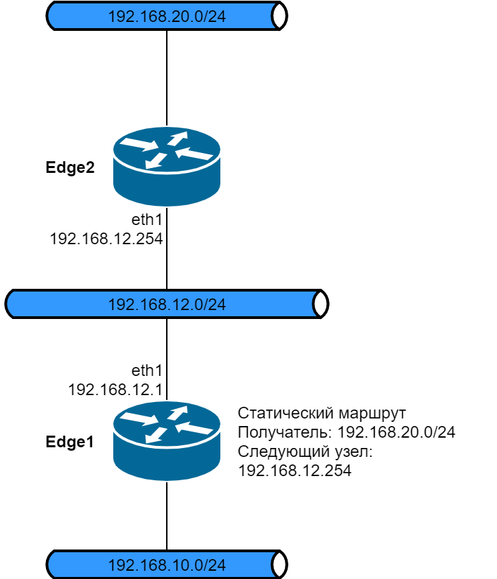 В этом примере представлены образцы настроек для основных статических маршрутов. После выполнения всех действий система будет настроена в соответствии с рисунком ниже. В этом примере создается статический маршрут, фактически указывающий, что «все пакеты, адресованные в сеть 192.168.20.0/24, следует переслать на адрес 192.168.12.254».