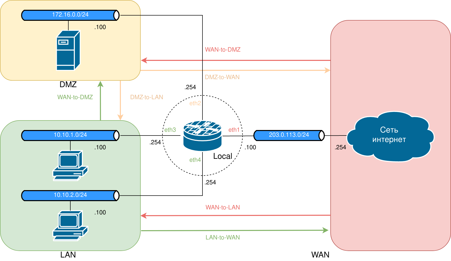 Помимо трех транзитных зон, на рисунке ниже есть и четвёртая зона – локальная зона, описывающая сам межсетевой экран.