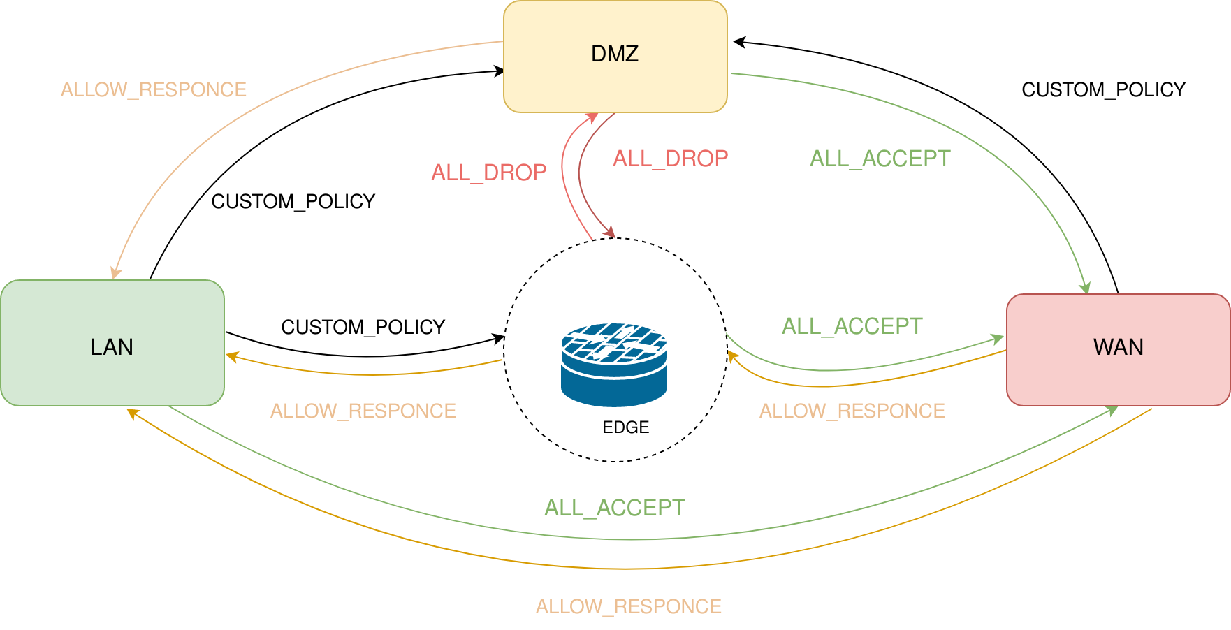 - Разрешен только ответный трафик WAN-to-LAN, EDGE-to-LAN, WAN-to-EDGE, DMZ-to-LAN.